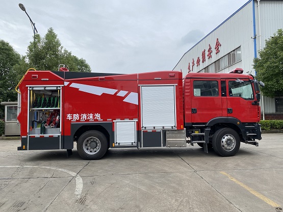 JDF5190GXFPM80/G6型泡沫消防車采用重汽汕德卡ZZ5206N471GF5底盤改裝而成。整車由消防員乘員室和車身兩大部分組成,乘員室為原裝雙排,可乘坐2+4人,該車為外露罐結構,車身前部為器材箱,中部為水罐,后部為泵房。