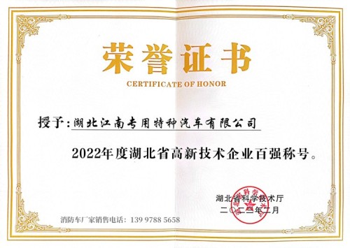 湖北江南獲得由湖北省科學技術廳、湖北省財政廳、國家稅務總局湖北省稅務局機關批準。由湖北省科學技術廳頒發的“2022年度湖北省高新技術企業百強稱號”榮譽證